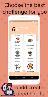Denna app är mer än bara en vanespårare; den är en dynamisk plattform för personlig utveckling. Markera dagliga uppgifter som slutförda för att samla poäng, som sedan kan användas för att anpassa din avatar, låsa upp motiverande påminnelser och exklusiva bakgrundsbilder. I tacksamhetsutmaningen kan du dela dina tankar anonymt med en inspirerande gemenskap, ta del av andras reflektioner, ge uppskattande "likes" eller skicka små gåvor. För att odla ett lugnare sinne erbjuder appen en dagboksfunktion där du kan registrera dina tankar och ditt dagliga humör, och sedan följa dina framsteg i en kalenderöversikt.