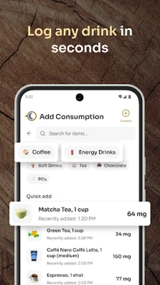 Caffeine Clock presenterar all denna information på en elegant och lättöverskådlig instrumentpanel. Här ser du en tydlig graf som visar din nuvarande koffeinnivå, beräknad nedgång och hur mycket koffein du kommer att ha i systemet vid en given tidpunkt. Med en enkel tryckning kan du skrubba genom grafen för att få exakta värden, och snabbt avgöra om du är redo för en kopp till eller om du bör lugna ner dig. Dessutom kan du hålla koll på ditt status direkt från hemskärmen tack vare praktiska widgets, som också tillåter dig att logga dina favoriter snabbt med ett enda tryck. Dess sömnmedvetna funktion varnar dig i förväg om dina beräknade koffeinnivåer riskerar att vara för höga vid din önskade läggningstid, vilket ger dig chansen att justera ditt intag.