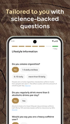 Caffeine Clock startar med en anpassad introduktion som fångar dina personliga preferenser och känslighet, som du naturligtvis kan ändra när som helst. Välj bland över 200 förinställda drycker, inklusive kaffe, te och energidrycker, eller skapa egna med anpassade storlekar och koffeinmängder för att matcha din unika rutin. För att ytterligare stödja dig kan du ställa in dagliga tröskelvärden för ditt koffeinintag och få diskreta varningar samt vägledning som hjälper dig att hålla dig inom dina gränser. Appen är helt offline och privat, utan krav på konto eller registrering; all din data lagras säkert på din egen enhet. Caffeine Clock fokuserar helt på att optimera ditt koffeinintag för bättre dagar och lugnare nätter.