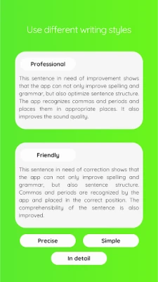 Dyk djupare in i språkets nyanser genom 'Grammars' dynamiska funktioner för utveckling. Appen ger dig möjlighet att inte bara upptäcka dina misstag utan också att förstå varför de uppstår. Med skräddarsydda lektioner och övningar kan du metodiskt stärka din grammatik, finslipa din stavning och bemästra komplexa meningsstrukturer, steg för steg. Varje korrigering blir en lärdom som bygger upp din språkliga kompetens och hjälper dig att övervinna dina svagheter.