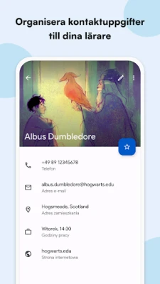 Håll alltid ditt schema och din veckoplanering nära till hands för att effektivt strukturera dina studier. Schemat är fullt anpassningsbart, där du kan färglägga varje ämne för en tydligare överblick, och integrerar sömlöst händelser från din kalender. Följ din akademiska utveckling genom att enkelt hantera betyg och ämnen, med automatisk beräkning av ditt genomsnitt som håller dig informerad om dina framsteg. Appen erbjuder även möjligheten att spela in föreläsningar, som sedan organiseras automatiskt, och förvara lärares kontaktuppgifter – såsom telefonnummer, mottagningstider och e-postadresser – för enkel åtkomst när du behöver dem som mest.