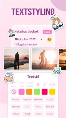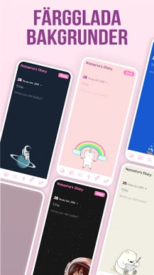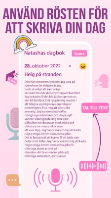 Min dagbok går bortom enkel text. Du kan berika dina anteckningar med bilder som fångar ögonblicket eller spela in dina tankar med din egen röst. En smart tal-till-text-funktion omvandlar dina muntliga funderingar till skriven text, vilket gör det enkelt att föra dagbok även när du är i farten. Dessutom erbjuder Min dagbok en palett av anpassningsmöjligheter; välj bland olika bakgrunder, textfärger och typsnitt för att låta din dagbok spegla exakt hur du känner dig, kompletterat med passande emojis för att förstärka känslan. Du kan även lägga till egna teckningar för att göra varje inlägg unikt personligt.