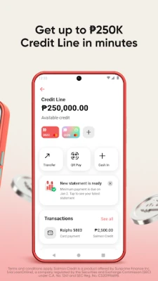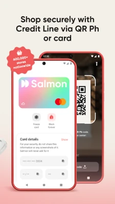 Inom Salmon hittar du LoanOnline, en onlinekreditplattform som drivs av Sunprime Finance Inc. Här kan du utforska Salmon Credit, en återanvändbar kreditlina på upp till ₱250 000 som är redo att användas närhelst du behöver den. Ansökningsprocessen är enkel – ett filippinskt mobilnummer och giltigt ID är allt som krävs, och godkännande sker ofta inom minuter. Våra användare värdesätter Salmon Credit för dess fördelar: få upp till 62 räntefria dagar vid full och tidig återbetalning, tillgång till det säkra Salmon Virtuella Kortet direkt i appen, och möjligheten att endast betala ränta på det belopp du faktiskt använder. Dessutom accepteras det brett med QR Ph hos över 600 000 handlare i Filippinerna, vilket gör det till en digital, säker och praktisk följeslagare.